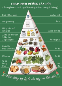 Tháp dinh dưỡng là kim tự tháp thể hiện lượng thực phẩm tiêu thụ cần thiết. Công cụ này giúp bạn dễ dàng xây dựng chế độ ăn lành mạnh. Vậy xây dựng tháp dinh dưỡng cân đối như thế nào để có một sức khỏe dẻo dai? Tháp dinh dưỡng được phân tầng rõ ràng, biểu thị mức tiêu thụ thực phẩm cần thiết cho một người trưởng thành trong vòng 1 tháng. Tháp được chia theo từng nhóm thực phẩm khác nhau, biểu thị mức dinh dưỡng tiêu chuẩn và chế độ dinh dưỡng hợp lý, giúp chúng ta có sức khỏe tốt và tránh bệnh tật. Hãy cùng Hello Bacsi tìm hiểu về tháp dinh dưỡng nhé. Tầm quan trọng của tháp dinh dưỡng cân đối Tháp dinh dưỡng đóng vai trò quan trọng trong việc thiết lập và duy trì thói quen ăn uống lành mạnh và cân bằng. Tháp dinh dưỡng giúp bạn có được một loạt thực phẩm bổ dưỡng trong chế độ ăn uống mỗi ngày. 1. Giúp cải thiện thói quen ăn uống Nhiều người muốn có chế độ ăn uống tốt hơn nhưng không biết bắt đầu từ đâu. Tháp dinh dưỡng sẽ hướng dẫn cho bạn loại thức ăn nào cần ăn nhiều hơn và thức ăn nào phải cắt giảm. Ngoài ra, bên cạnh tháp dinh dưỡng, đĩa ăn dinh dưỡng cũng khuyến khích bạn ăn nhiều traí cây và rau quả, vì biểu tượng thực phẩm được chia thành bốn phần chính, với một phần tư trái cây và một phần tư cho rau. 2. Nhắc nhở bạn ăn uống lành mạnh Bạn hãy in hình ảnh tháp dinh dưỡng hoặc đĩa ăn dinh dưỡng và dán lên tủ lạnh hoặc bất kỳ khu vực nào dễ nhìn thấy trong bếp. Điều đó có thể khuyến khích bạn ăn uống lành mạnh, nhắc nhở bạn về những loại thực phẩm bạn đã ăn và những thứ bạn cần bao gồm trong bữa ăn tiếp theo. Ví dụ như nếu bữa ăn sáng của bạn chưa có sữa, tháp dinh dưỡng hoặc đĩa ăn dinh dưỡng sẽ nhắc nhở bạn nên có một bữa ăn nhẹ như sữa chua hoặc bao gồm sữa ít chất béo khi ăn bữa trưa. Phân tầng của một tháp dinh dưỡng cân đối Tháp dinh dưỡng cho người trưởng thành gồm 7 tầng: muối, đường, chất béo, chất đạm, các loại quả, rau xanh và lương thực được chia thành 5 nhóm với chỉ số trung bình cụ thể bên dưới. Để có sức khỏe dẻo dai và phòng ngừa bệnh tật, các chuyên gia dinh dưỡng khuyến cáo nên dựa vào tháp dinh dưỡng để xây dựng chế độ ăn hợp lý. Số lượng các nhóm thực phẩm được biểu diễn rõ ràng trong tháp dinh dưỡng. Các nhóm thực phẩm ở đỉnh tháp nên hạn chế ăn, nhóm thực phẩm ở đáy tháp cho phép ăn nhiều. 1. Nhóm lương thực trong chế độ ăn dinh dưỡng Đây chính là nguồn cung cấp năng lượng chủ yếu, chiếm 60% – 65% trong tổng năng lượng khẩu phần của người trưởng thành. Theo tính toán, cứ 1g carbohydrat cung cấp 4 kcal năng lượng. Nhóm này tập hợp nhiều loại thực phẩm: ngũ cốc, khoai tây, khoai lang, bánh mì, gạo, mì, nếp, ngô,…Trong đó, gạo là thực phẩm quen thuộc chính của các gia đình người Việt. Bạn có cũng thể lựa chọn ngũ cốc nguyên hạt (gạo nâu, yến mạch và quinoa), bánh mì, mì ống, ngũ cốc chưa chế biến và các loại thực phẩm ngũ cốc đã qua tinh chế. 2. Nhóm rau, củ, quả Nhóm này chiếm phần lớn trong tháp dinh dưỡng. Lý do đơn giản là vì chúng ta nên xây dựng chế độ ăn uống giàu thực phẩm từ thực vật (khoảng 70% chế độ ăn). Các loại thực phẩm từ thực vật chứa nhiều chất dinh dưỡng như vitamin, khoáng chất và chất chống oxy hóa. Ngoài ra, rau, củ, quả, hạt cũng là nguồn chính cung cấp carbohydrate và chất xơ trong chế độ ăn uống. Trong đó, trẻ em, thanh thiếu niên và người lớn phải ăn ít nhất 2 phần trái cây và 5 phần rau hay đậu mỗi ngày. 3. Nhóm thực phẩm chứa đạm trong chế độ dinh dưỡng hàng ngày Lớp giữa của tháp dinh dưỡng bao gồm sữa, sữa chua, phô mai, thịt nạc, gia cầm, cá, trứng, hạt và nhóm thực phẩm họ đậu. Thực phẩm trong nhóm sữa, sữa chua, phô mai chủ yếu cung cấp canxi, protein cùng với các vitamin và khoáng chất khác. Nhóm thực phẩm này bao gồm đậu nành, gạo hoặc ngũ cốc có ít nhất 100 mg/100 ml canxi. Bạn nên chọn các loại thực phẩm ít chất béo trong nhóm thực phẩm này để hạn chế hấp thu quá nhiều calo từ chất béo no. Thực phẩm trong nhóm thịt nạc, gia cầm, cá, trứng, hạt và ngũ cốc là những thực phẩm chính cung cấp protein. Tuy nhiên, mỗi thực phẩm cũng cung cấp một hỗn hợp các chất dinh dưỡng, bao gồm iốt, sắt, kẽm, vitamin B12 và chất béo tốt. 4. Nhóm dầu, mỡ Nhóm này bao gồm các chất béo lành mạnh vì bạn cần một lượng nhỏ chất béo này mỗi ngày để hỗ trợ tim và các chức năng não. Nhóm các chất béo cung cấp cho con người nhiều năng lượng và là dung môi giúp hòa tan các vitamin tan trong dầu dễ dàng. Trong số đó phải kể đến các vitamin quan trọng như vitamin A, D, E và K. Bạn nên chọn các loại thực phẩm chứa chất béo lành mạnh, chẳng hạn như dầu ô liu nguyên chất, dầu hạt thay vì thực phẩm có chứa chất béo bão hòa. Ngoài ra, bạn có thể nạp chất béo cho c